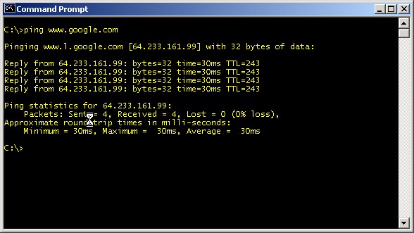This test is to ping a well-known site like www.google.com or www.ebay.com or your ISP's web server (e.g., www.verizon.com, www.xfinity.com). The successful results of such a ping are shown below. If you get a successful ping to one of these sites, but you can't reach a particular site like www.joes-small-insignificant-web-site-is-down.com, your connection is probably just fine. Poor Joe, however, has got a problem with his/her site. If one well-known site doesn't answer the ping, try another. Every site goes down occasionally. They might just be doing routing maintenance or upgrading. If pinging Google and one or two other well-known sites all fail, go to the trouble shooting section below.
